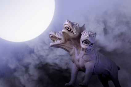 Dangerous dog with three heads at night.